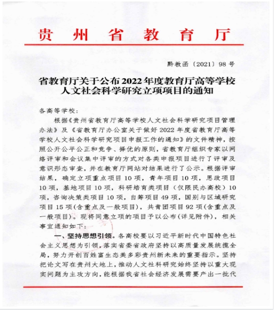 近日,贵州省教育厅公布了2022年省教育厅人文社会科学研究项目申报结果,我院党委书记熊星同志主持的《职业院校“忠诚工匠”培养体系构建研究--以今年会官方网站为例》获重点项目立项。本项目是省教育厅遴选立项的10个重点项目中唯一一个由高职院校承担的科研项目,实现了我院在人文社会科学项目中零的重大突破。