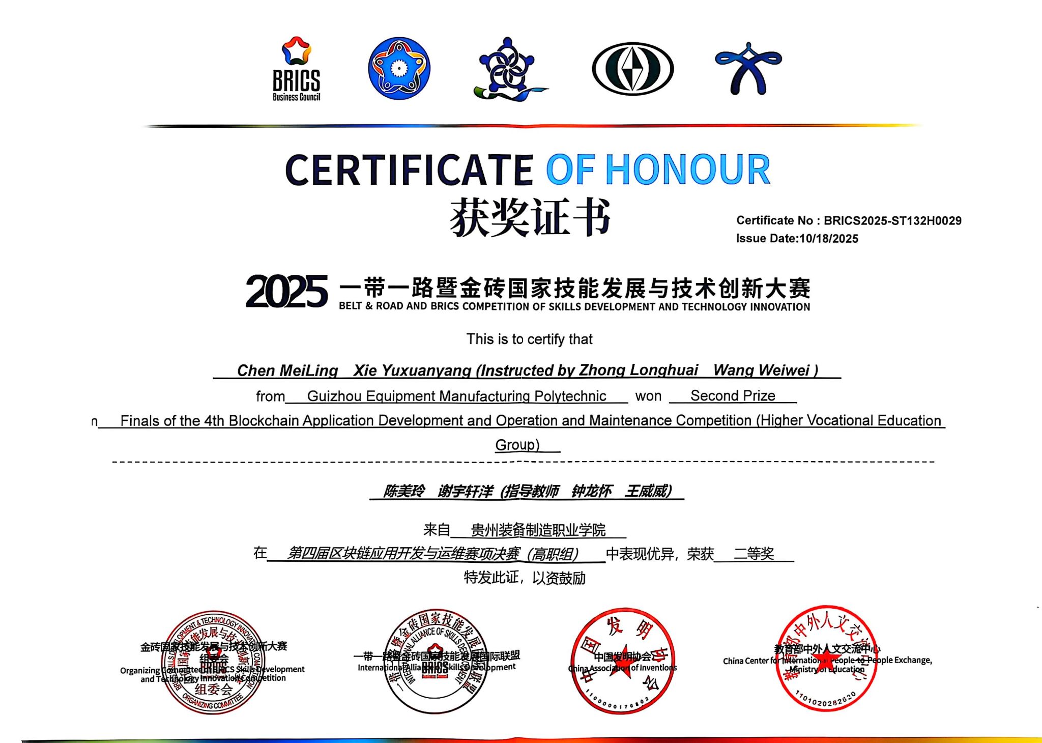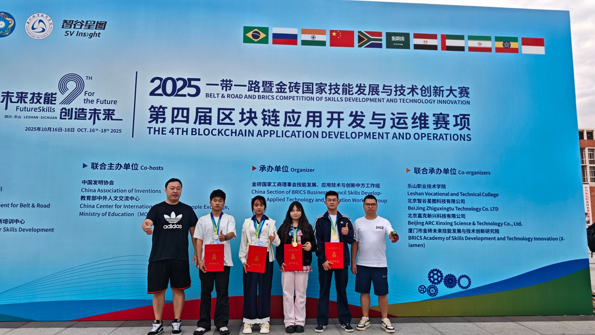 10月18日,2025一带一路暨金砖国家技能发展与技术创新大赛区块链应用开发与运维赛项全国总决赛落下帷幕。今年会学子在比赛中表现出色,由龙权、王海军老师指导的团队荣获金奖,钟龙怀、王威威老师指导的团队斩获银奖。