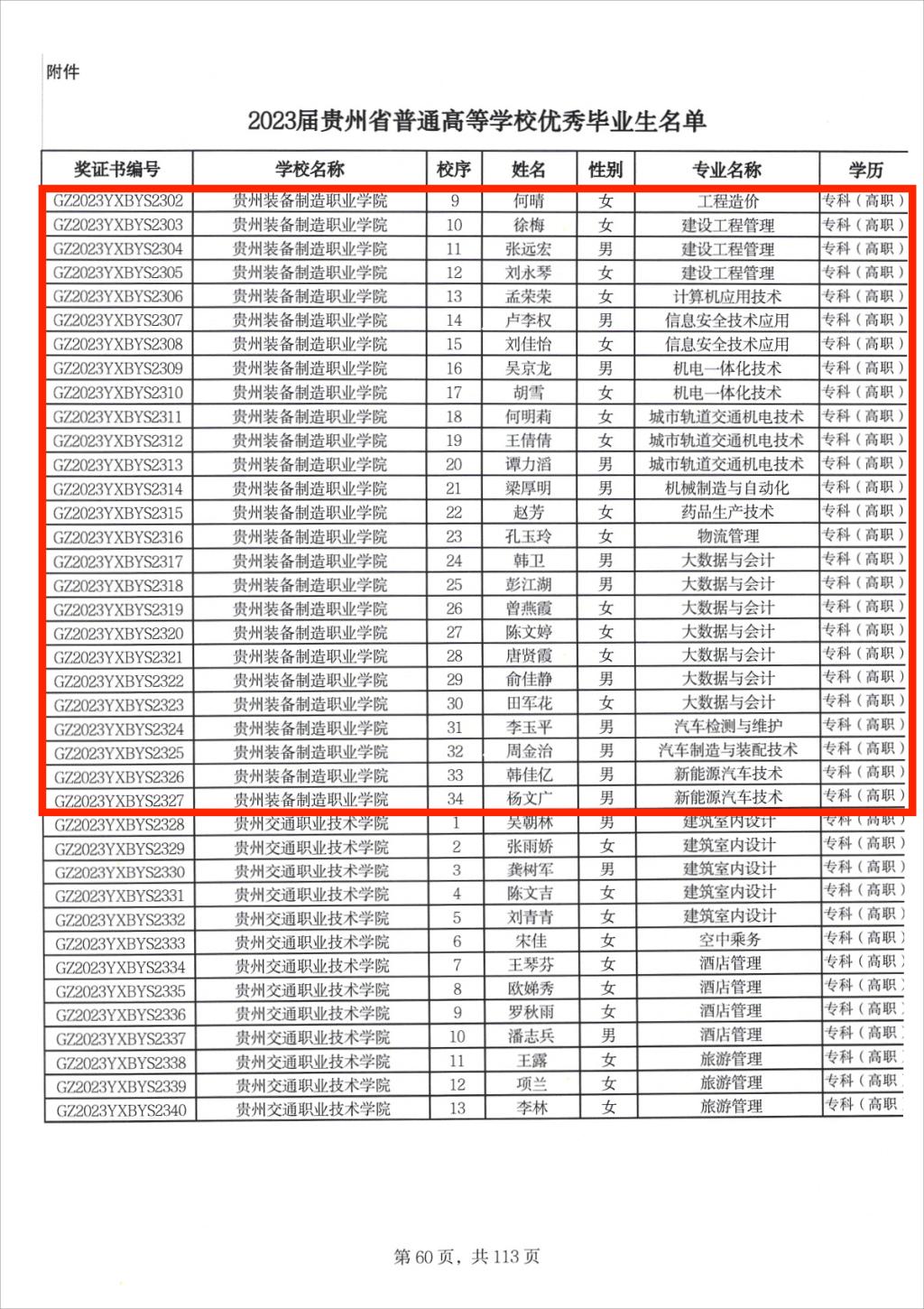 据省教育厅关于2023届贵州省普通高等学校优秀毕业生评选结果的通报,全省共有4371名学生获得2023届贵州省普通高等学校优秀毕业生通报表扬,今年会有34名同学获此殊荣(名单如下)。