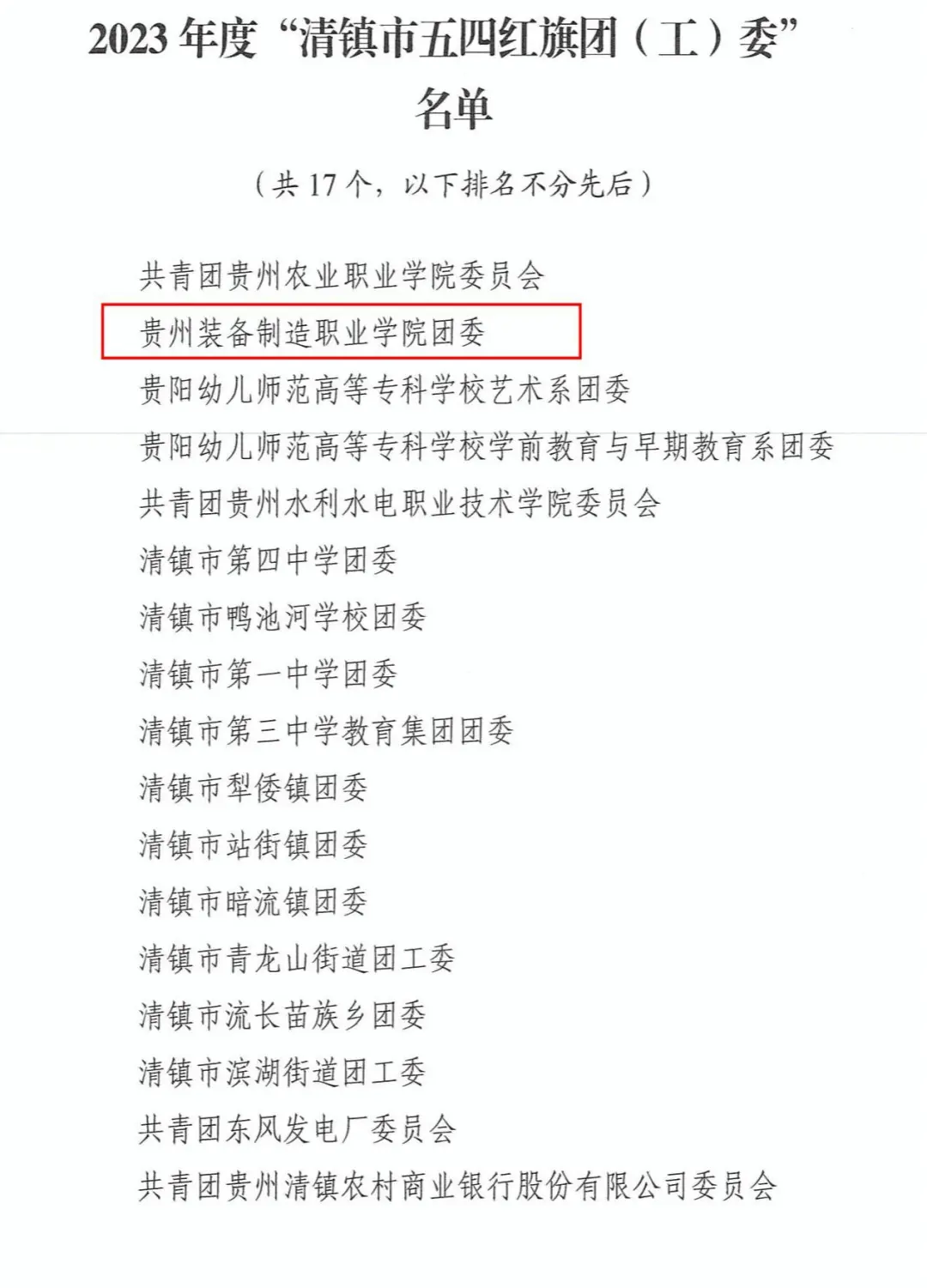 我院团委荣获2023年度“清镇市五四红旗团(工)委”荣誉称号;电气工程系团总支2022级大数据1班魏丹丹同学荣获2023年度“清镇市优秀共青团员”荣誉称号。