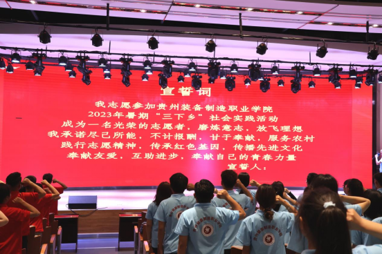 出征仪式上,学院党委副书记杨丽芳同志宣读了学院2023年暑期文化科技卫生“三下乡”社会实践队伍名单,并强调,志愿服务是实践育人的重要载体,未来一段时间里,在党旗的指引下,团旗的号召下,全院20支队伍,近200名青年师生将会用他们的足迹遍及遵义、六盘水、安顺、荔波、台江等地,将装院青年学子朝气蓬勃的身影活跃在各个实践活动中。希望同学们通过参加社会实践活动,用心去体会,用脚步去丈量乡村大地,在志愿服务过程中宣传贯彻习近平新时代中国特色社会主义思想,坚定理想信念,厚植家国情怀,提升国情民情认知,培养与人民群众的真挚感情,不断增强服务社会、奉献家乡的使命感和责任感。希望参与暑期文化科技卫生“三下乡”的20支社会实践队伍,走进社区、走进乡村、走进基层,发扬艰苦精神,拼搏奋斗的精神,用青春的激情奏响“清澈的爱、只为中国”的时代强音,用青春的行动践行“请党放心、强国有我”的铮铮誓言。
