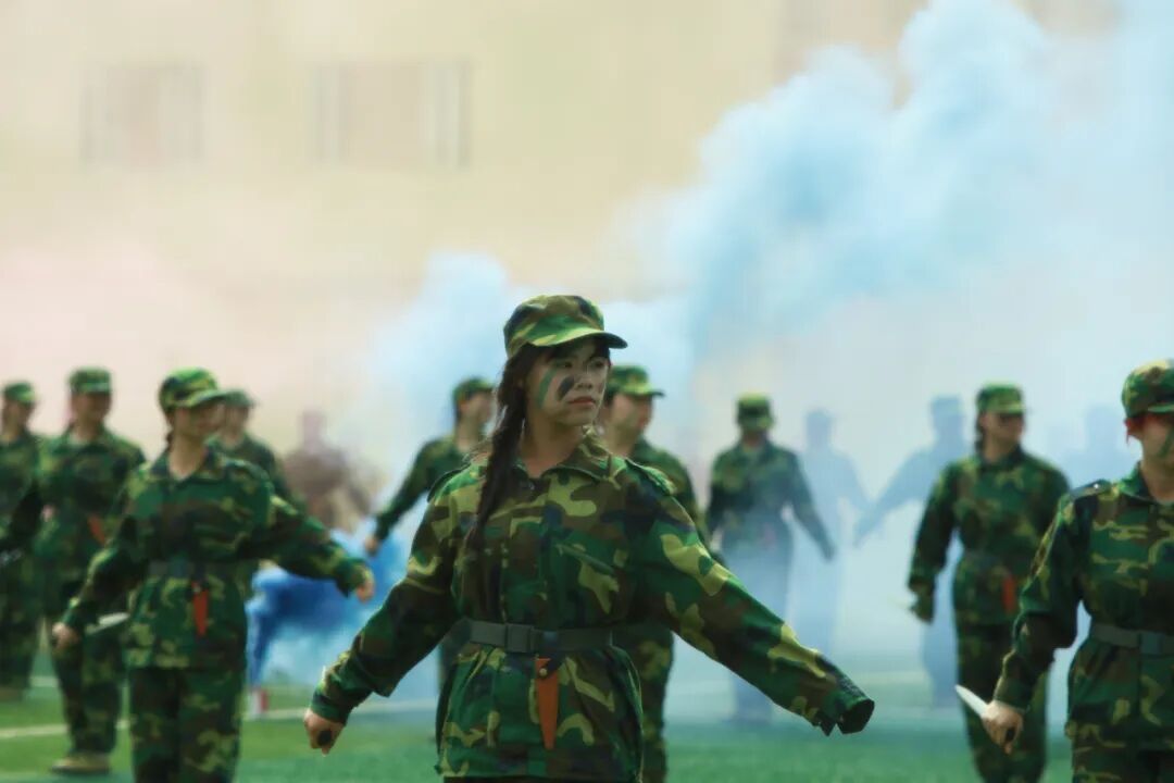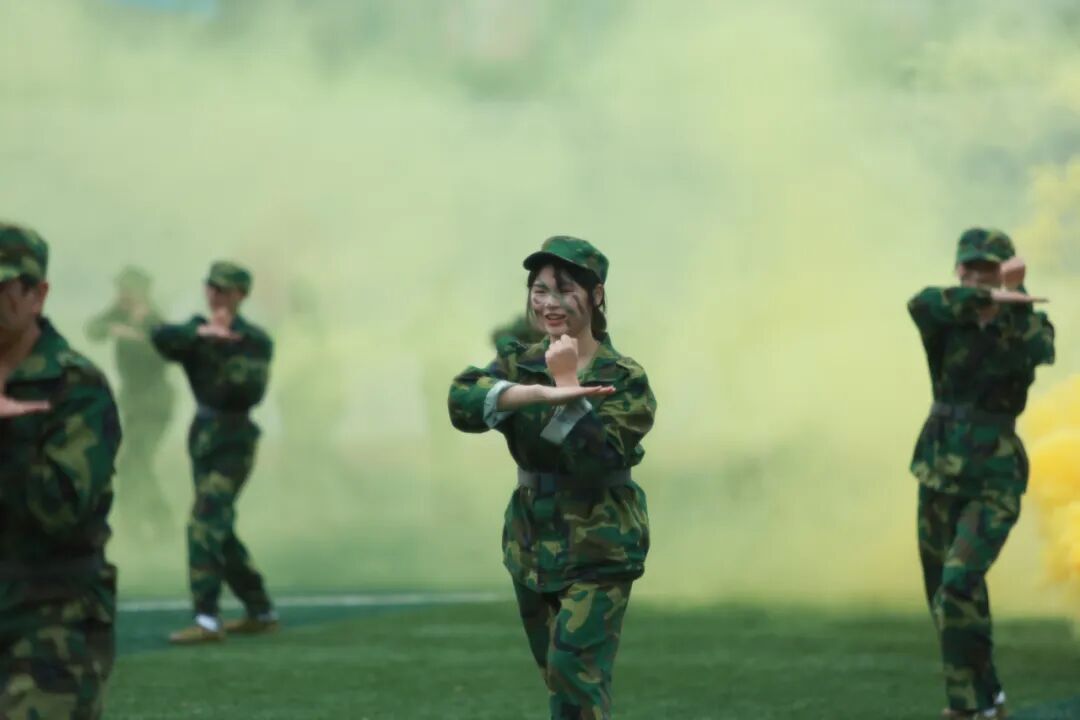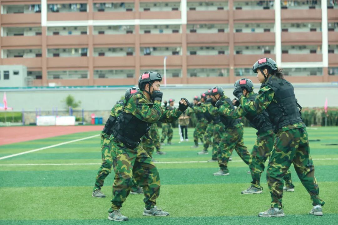 伴随着雄壮的国歌声,2025级学生国防教育思政课汇报正式开始。成果汇报环节,同学们闻令而动、身着戎装、身姿挺拔、眼神坚定,以一场震撼的表演,充分展示了军训成果和新时代青年学生的自信与风采。雄壮豪迈的中国人民解放军军歌奏响,各军训方阵迈着整齐划一的步伐、喊着铿锵响亮的口号,依次昂首通过主席台,接受全体师生的检阅。各方队特色鲜明、气势拉满:战术方队动作利落、协同默契,尽显实战素养;擒敌拳方队出拳刚劲、落地有声,气场磅礴震撼;刺杀操方队劈刺威猛、杀气腾腾,尽显军人血性;匕首操方队英姿飒爽、眼神锐利,满含昂扬斗志;军体拳表演刚劲有力,同学们以昂扬斗志交出军训优秀答卷。