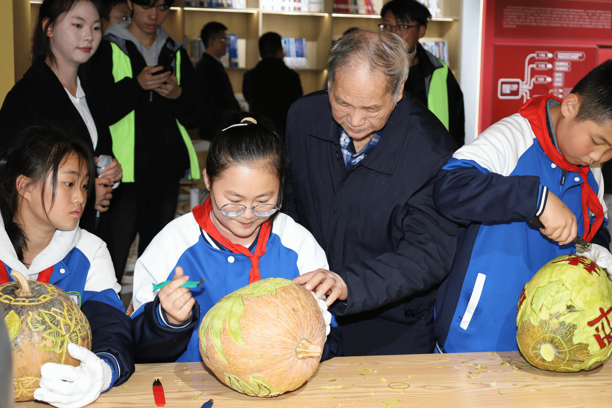 小学生们体验瓜灯雕刻的非遗技艺