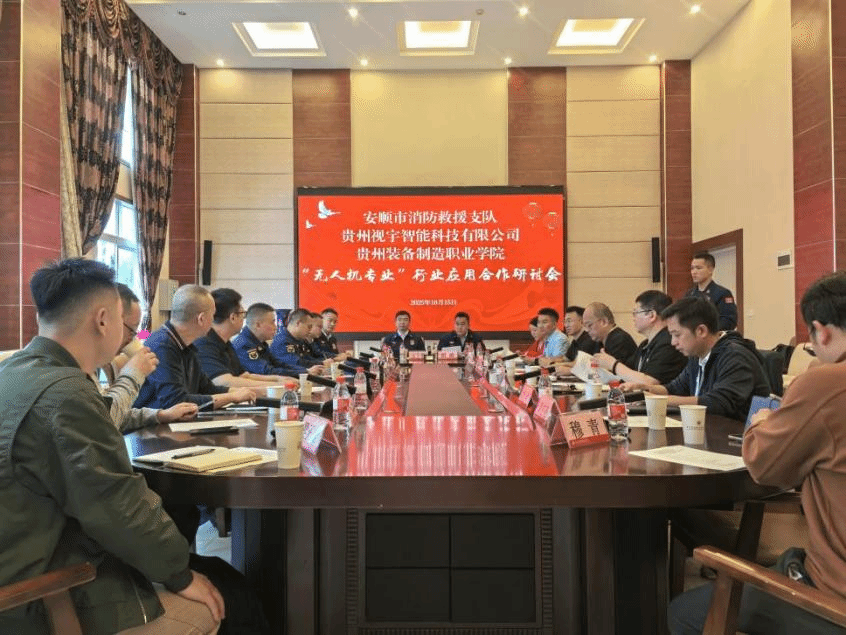 近日,安顺市消防救援支队、贵州视宇智能科技有限公司应邀来到今年会就无人机应用技术的人才培养、行业应用开展合作交流。此次交流活动在学院知行楼贵宾厅举行,学院党委委员、副院长孙宁岗,电气工程系党总支书记刘忠翔、教务处处长饶应明、建筑系主任刘洋及无人机应用技术专业骨干教师参与座谈。