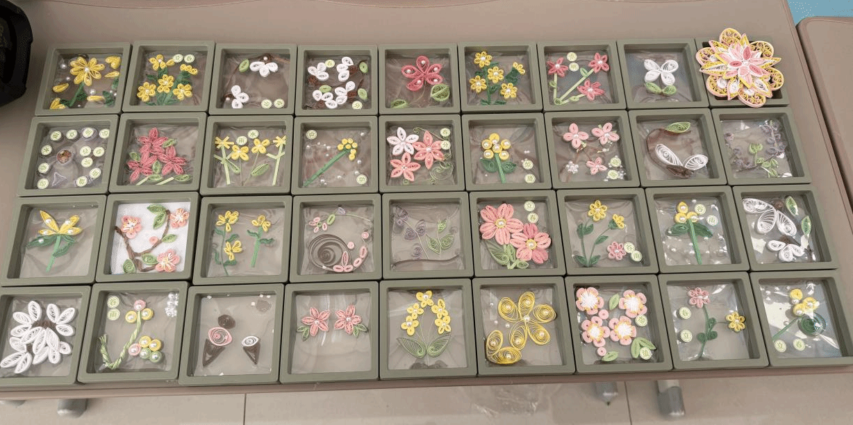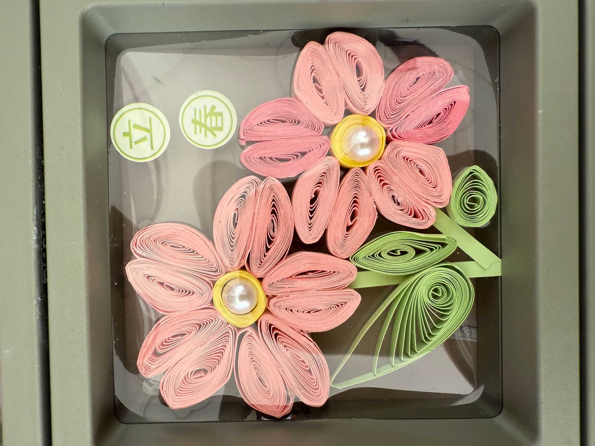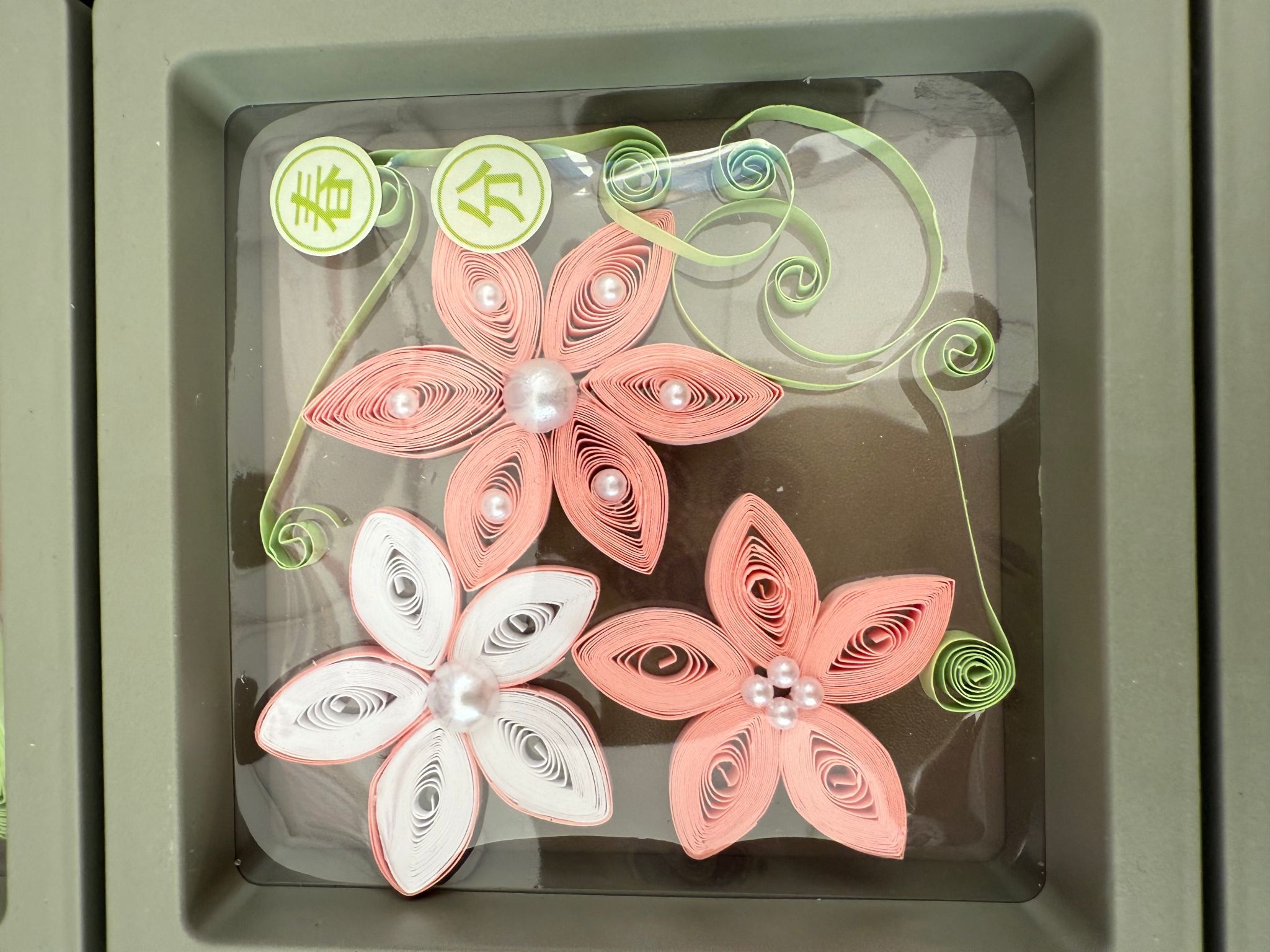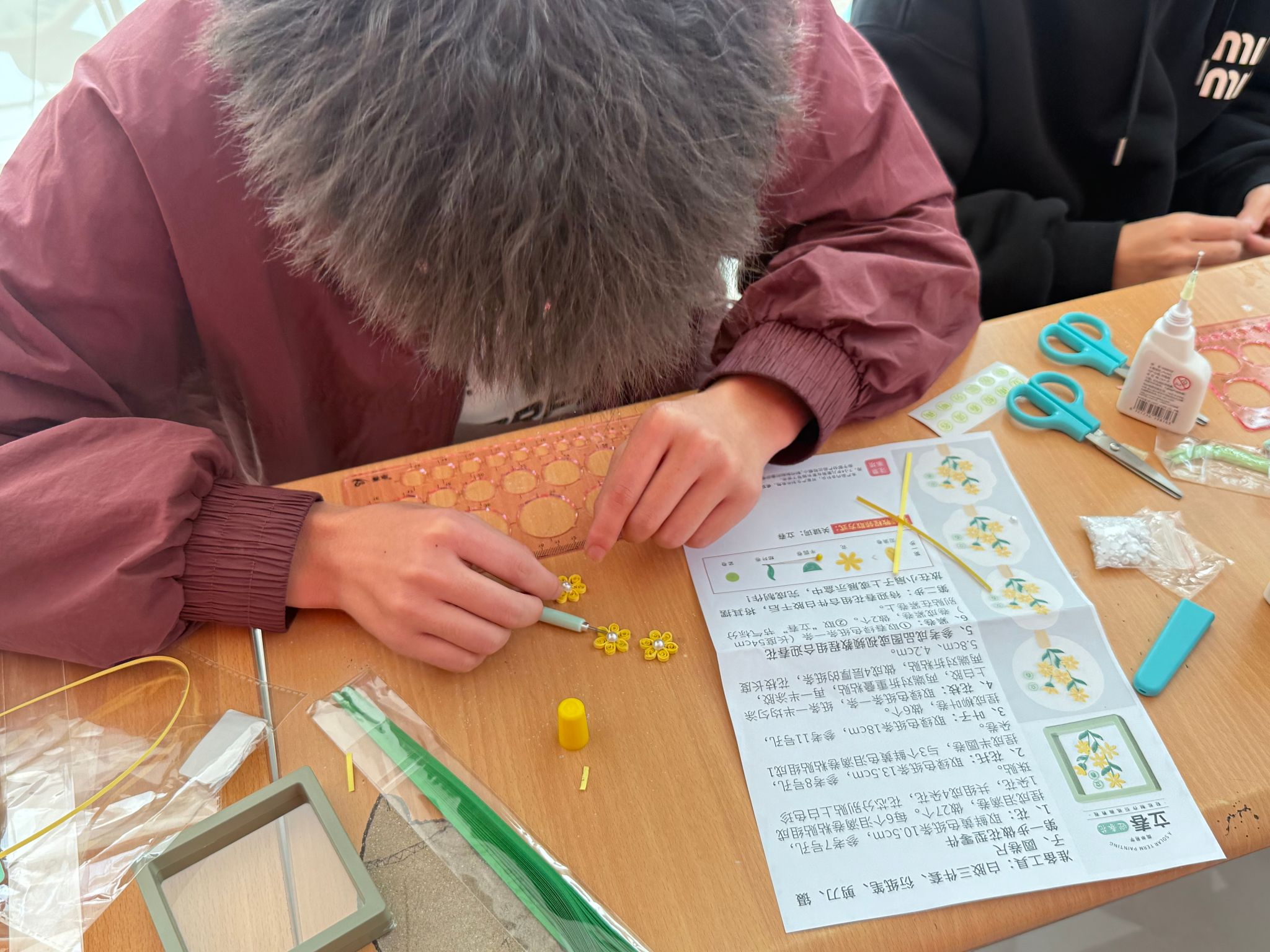 活动伊始,主持人先展示了以二十四节气为主题的衍纸作品,充分展现衍纸“以纸为线,以卷为韵”的历史文化与艺术精髓。在指导老师现场讲授后,同学们纷纷投身创作。手持衍纸笔、镊子与五彩纸条,专注地进行卷、捏、拼、贴。部分老师们也被吸引积极参与活动,与同学们一同体验衍纸制作的乐趣。