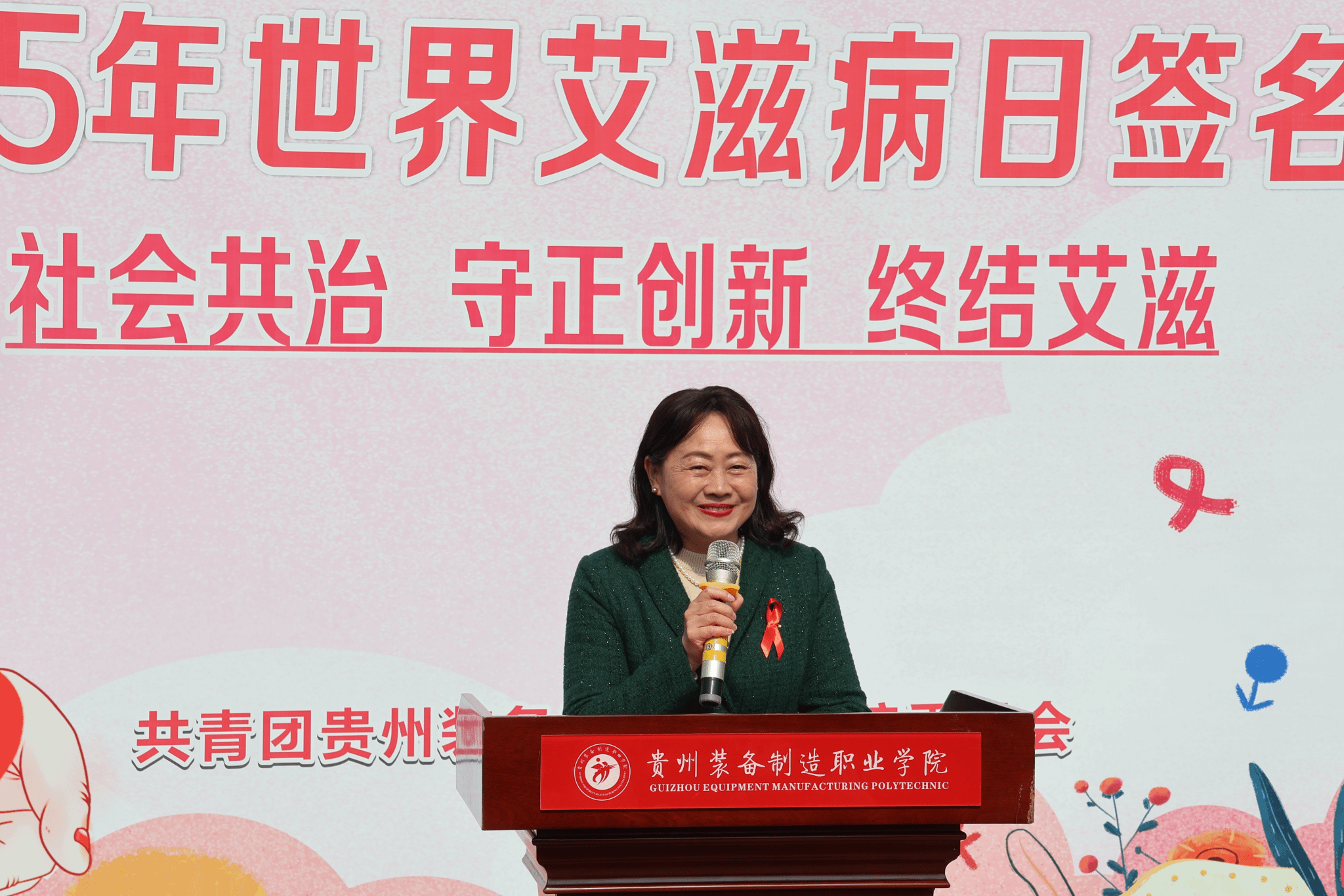 杨丽芳副书记在致辞中指出艾滋病防治是一项需要人人参与的工作。当前,我国艾滋病防控形势严峻,高校作为青年成长成才的重要园地,更应成为防艾宣传的前沿阵地。她提醒每一位师生,尤其是青年学子要主动担当,积极作为,以实际行动参与到艾滋病防治的校园实践与社会共治中。她向同学们提出了三点希望:一是要增强防范意识,树立健康责任观。希望同学们真正把“健康第一”的理念内化于心、外化于形,筑牢思想与行为的“防火墙”;二是要主动学习防艾知识,争做防艾宣传“校园使者”。希望同学们主动学、主动讲,把防艾知识传递给更多同学;三是要践行健康生活理念,筑牢安全底线。自觉远离高危风险行为,培养积极向上、理性平和的生活态度。