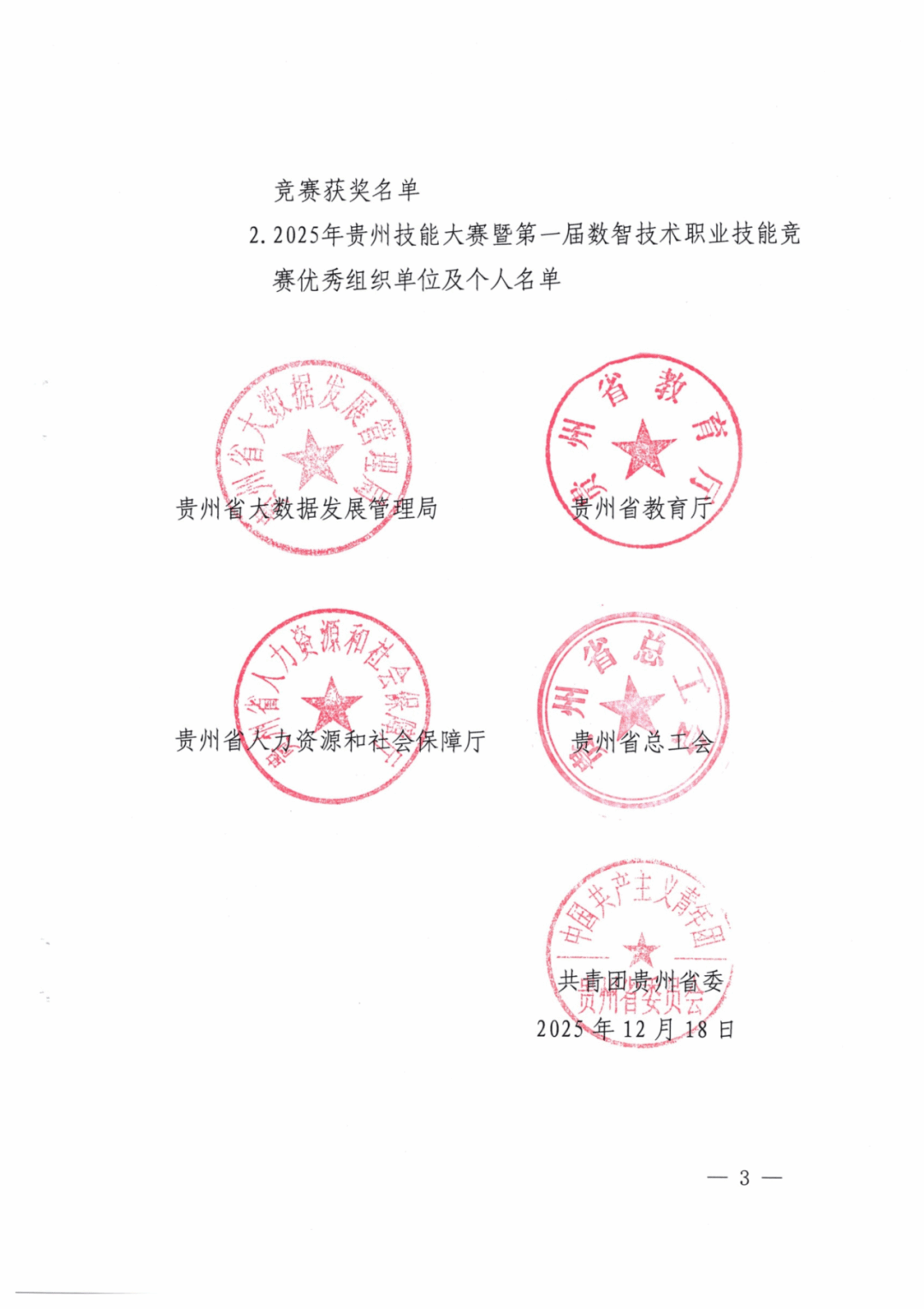 在贵州省大数据发展管理局、教育厅、人力资源和社会保障厅、总工会、共青团贵州省委五部门联合主办的“2025年贵州技能大赛暨第一届数智技术职业技能竞赛”中,我院师生团结协作、奋勇拼搏,凭借出色的专业能力与创新表现,在比赛中脱颖而出,荣获多项优异成绩,展现了学院良好的育人成效与师生昂扬的精神风貌