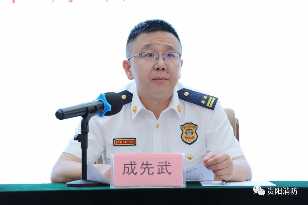 成先武副政委讲话,感谢学院两年来帮助贵阳市消防救援支队培养了百余名装备技师骨干,为全市各基层队站承担消防装备维护管理,提升队伍战斗力发挥的重要作用。要求本期培训学员:一是提高认识,深刻领悟培训意义。二是深学笃行,聚力提升培训实效。三是从严管理,切实展现队伍形象。四是优化机制,深化人才培育平台。
