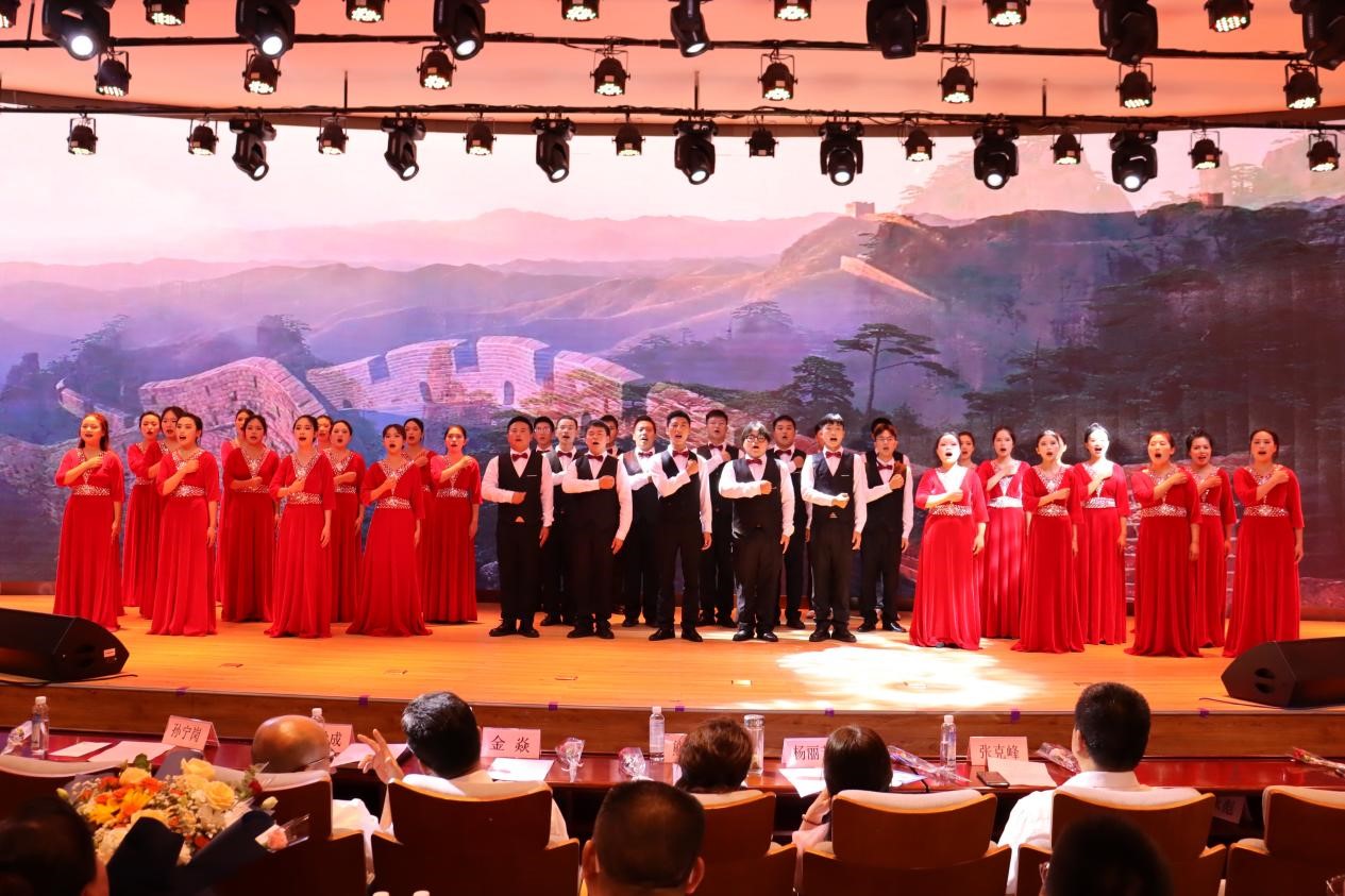 伴随着庄严的旋律,全体教师齐声高唱《中华人民共和国国歌》。