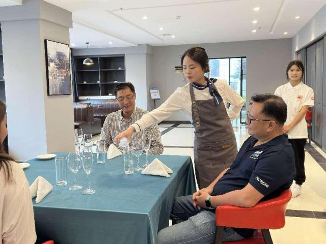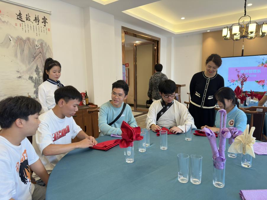 研学团最后一站来到中餐厅实训室。大家参观了中式餐厅摆台,体验中国饮食文化。随后,经济管理系同学现场教学餐桌折花,例如玉米花、荷花、等等,大家都对中国餐饮文化的精妙赞不绝口。一位新加坡学生还说到她会折千纸鹤,她说千纸鹤是代表长命百岁和好运,把千纸鹤放在家中,寓意保佑家人好运平安,也寓意着两国之间的友好交流。此次流活动结束后,研学团同学们纷纷表示,在本次交流活动中,深刻领悟到了中国文化的魅力和博大精深,学习到了中国酒文化之精华,华夏汉服之美华丽,中国茶艺之神奇,中国诗词之韵味,尽显文明古国之风范。经济管理系学子也表示很荣幸参加了2023“知行贵州”丝绸之路青少年交流计划,接待外国同学,收获良多,体会颇深!