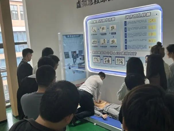 当发现患者突然倒地,先呼叫,发现患者意识不清,摸颈动脉,如无搏动,胸廓无起伏,呼吸停止,叫周围的人拨打120。立即给予心肺复苏术。将患者置于坚硬平面上。头颈躯干在同一直线。解开衣领及裤带,充分暴露胸部。给予胸外按压及人工呼吸。胸外按压的部位时双乳头连线与前正中线交界处。按压的频率是每分钟100—120次。按压的幅度是5—6cm。给予30次胸外按压,进行2次人工呼吸。开放气道,清除口腔内异物及分泌物。捏住患者鼻翼,用口包入患者口部,吹气连续2次。胸外按压与人工呼吸的比例是30:2。进行5个循环对患者进行1次检查。张老师做完流程讲解后亲自示范并呼吁同学体验急救过程并分析指导操作让师生更能真实还原突发场景应急。