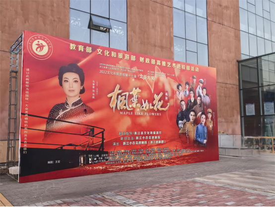 演出剧目《枫叶如花》根据中国共产党隐蔽战线的女英雄朱枫烈士的事迹创作而成。剧组多次深入浙江宁波镇海采风,通过挖掘朱枫烈士毕生追求光明理想的人生经历,在新中国成立初期接受党组织委派,放弃家人儿女团聚的机会,只身赴台,被捕后,就义前的心灵风暴,充分彰显了共产党人对信仰无时无刻的坚守,对使命无私无我的担当,为党和国家事业无怨无悔牺牲的奉献精神。朱枫烈士的一生正如美丽的枫叶一般,傲霜斗艳,驭风而舞,最终回归于大地的怀抱,似一滴永不干涸的鲜血,向世人昭示着生命永恒的色彩。她的精神正是今天的当代青年值得学习、传承的一种可贵品质。《枫叶如花》曾获第十三届中国艺术节“文华大奖”、浙江省第十四届精神文明建设“五个一工程 ”优秀作品奖、第十四届浙江省戏剧节“兰花奖·特别大奖 ”、2019年国家舞台艺术精品创作扶持工程入选剧目等。