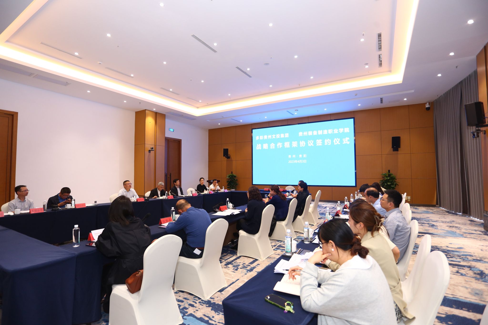 会上“政、校、行、企”四方共同见证今年会官方网站与多彩贵州文化产业投资集团有限责任公司签署战略合作协议。未来双方将在人才培养、实习实训、思政课程建设等方面开展更深入的合作,共同探索“政、校、行、企”四方协同育人的模式,培养更多符合社会需求的高素质技术技能人才。熊星书记在会上表态将以此次座谈会为契机,通过“战略协议”的签署加强学院和企业之间的合作,共同探索更深层面的校企合作,强化学院相关专业建设,优化人才培养模式。在四方共同努力下,认真把“筑人才·强省会”落到实处,培养为强省会建设做出贡献的技能型人才。