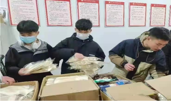 学生会工作人员给同学们发放防寒物资