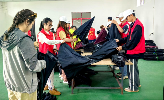 大学生志愿者们在林哨村制伞加工基地学习并参加实践