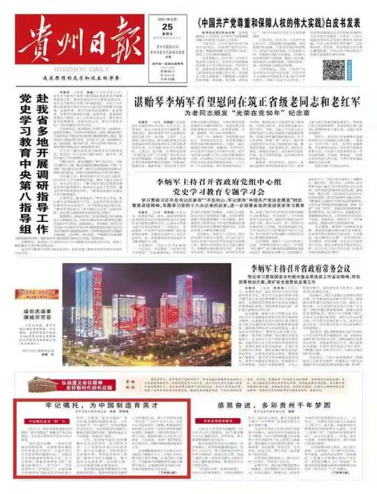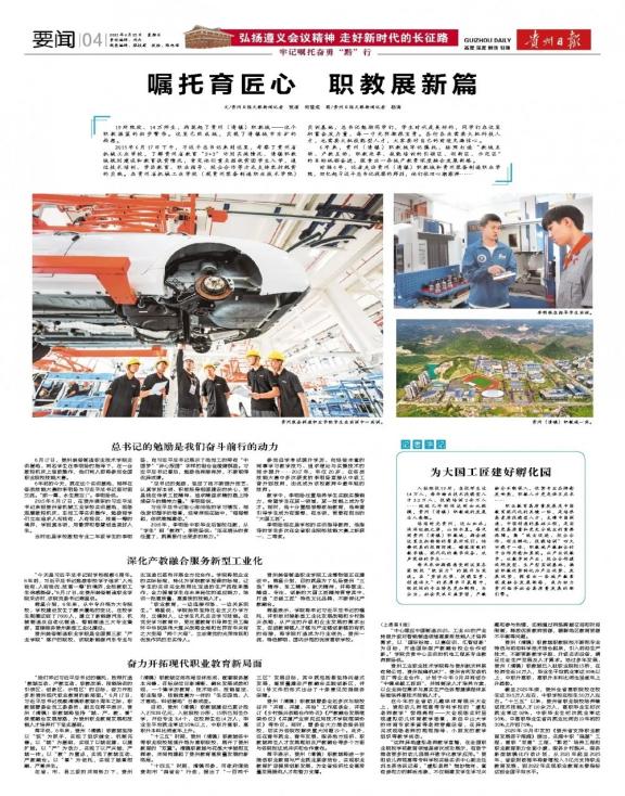 6月25日,贵州日报以《[弘扬遵义会议精神 走好新时代的长征路]——嘱托育匠心 职教展新篇》和《[弘扬遵义会议精神 走好新时代的长征路]——牢记嘱托 为中国制造育英才》为题,分别在01版和04版刊登报道学院职业教育的发展情况!