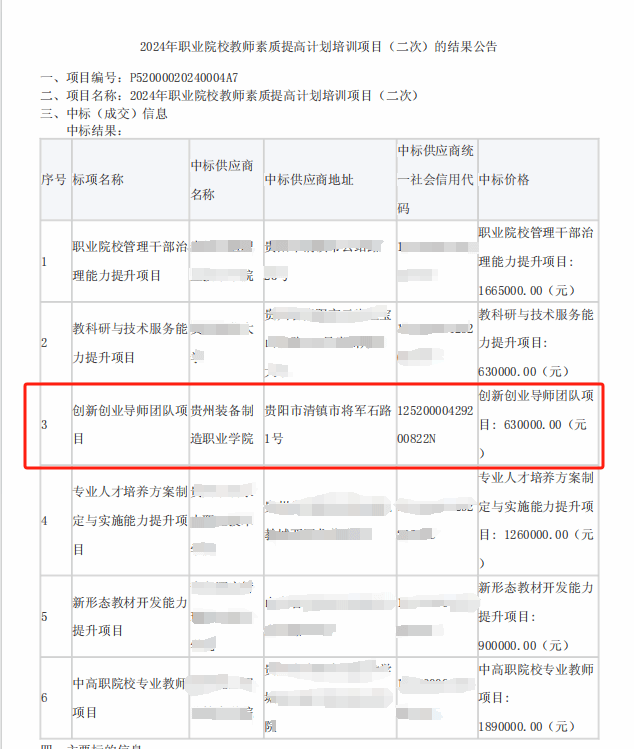 6月14日,贵州省政府采购网公布2024年职业院校教师素质提高计划培训项目(二次)中标结果,今年会官方网站成功中标品目六:创新创业导师团队项目,中标金额为63万元。