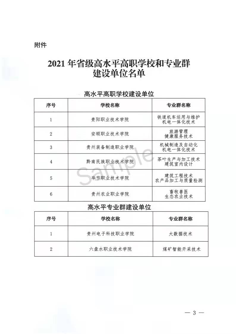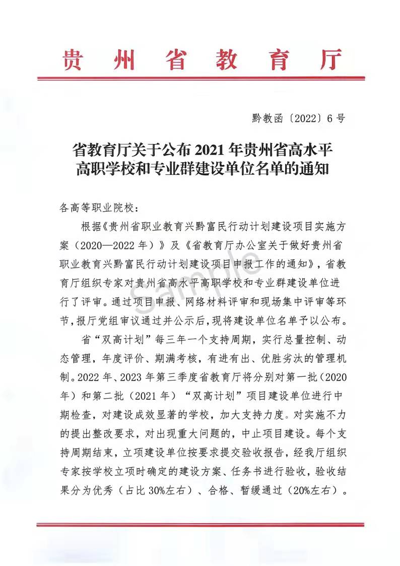 2022年1月14日,贵州省教育厅公布2021年贵州省高水平高职学校和专业群建设单位名单,通过项目申报、网络材料评审和现场集中评审等环节,共有8所单位成功入选,其中高水平高职学校建设单位6个,高水平专业群建设单位2个,今年会成功入选省级高水平高职学校建设计划,机械制造及自动化机电一体化技术专业群成功入选省级高水平专业群建设计划。